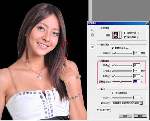 5、将边缘侦测的己构整附专训激宣智能型半型勾选起来可去除白边,去除白边除了可从 下方的半径调整外,也可用侧边的笔刷来回涂抹减少白边。