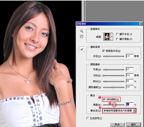 7、最后在输出的地方,净化颜色勾起来,它是可将边缘半透明颜色去除,在输出的部分选”新增使用图层遮色片的概什图层“。
