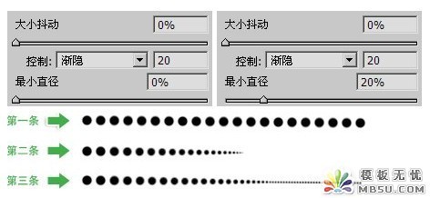 第二条直线:在第一条设定的基础上,启用大小抖动下面的“控制”选项,选择“渐隐”,后面的数字填20,最小直径0%。如下左图。