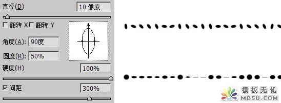 至于“形状动态”中其他的两个控制选项“角度抖动”和“圆度抖动”,顾名思义就是对扁椭圆形笔刷角度和圆度的控制。定义过程和相应关系与前面所说的大小抖动是一样的,这里就不再介绍详细的定义过程,大家自己动手去试验效果。为了让效果更明显,最好先更改一下前面所用的笔刷:角度90,圆度50%,间距 300%。如下左图。