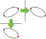 看起来似乎两种翻转效果是一样的,都是旋转了一定的角度,其实不是。翻转和旋转是两个截然不同的概念。如下右图,仔细观察一下椭圆边缘红色绿色蓝色三个点在翻转之后的位置,就会明白这并不是旋转所能够做到的。翻转又称为镜像。把上图左上角的椭圆画在纸上,然后拿一面镜子,分别放在图中两条细线的位置,从镜子中就看到的情景就是镜像。大家可以自己动手做做,看看那镜像是不是上图的效果。