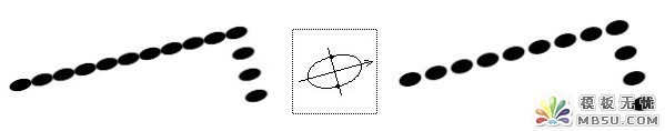 因为椭圆有两条标准作图半径(直径),一条最长一条最短,称为长半径(直径)和短半径(直径)。作为笔刷间距的是前后两个圆点的圆心距离,而这个距离正是以短半径(直径)作为标准的。注意我们设置的间距为200%,如果椭圆的长直径为10像素,短直径为5像素,笔刷圆点的圆心距离就是5x200%=10像素。此时如果沿着椭圆的长直径方向绘制,将会看到原点头尾相接,因为圆点之间10像素的圆心距离和本身10像素的长直径相等。而只有沿着短直径方向绘制,才会真正看到200%的间距效果。如下中图,预览图中的两条直线就是椭圆的长直径和短直径,而左图就是大体沿着这两条直线的方向绘制的。