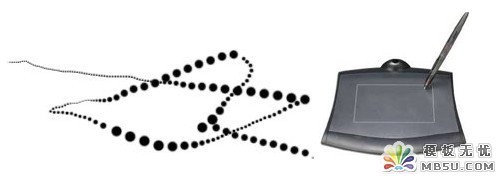 大小的控制除了渐隐之外,还可以使用钢笔压力、钢笔斜度、光笔轮、旋转。这三个选项需要有另外的硬件设备。如下左图是使用钢笔压力绘制的效果。所谓钢笔是一种输入设备,称为数字化绘图板。用一支电子笔在配套的底板上移动来代替鼠标。如下右图。