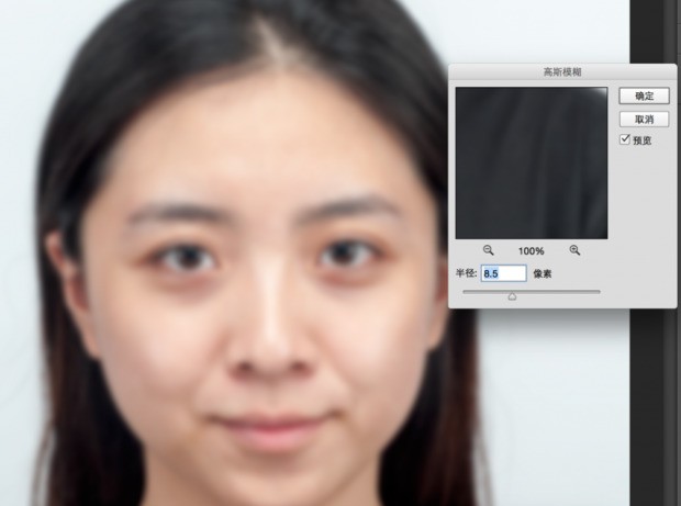 高斯模糊的半径调整以看不清皮肤上粗糙纹路为准,可以适当大一些,一般数值在8~9左右。