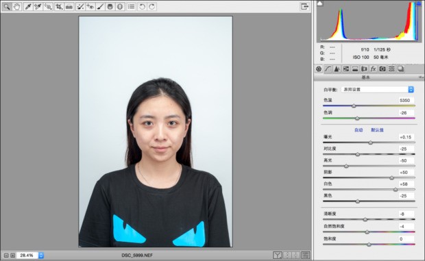 采用raw拍摄我们可以直接在Camera Raw中进行曝光调整。(在保证脸部细节的情况下,我们尽量将“白色”滑块数值调高,让背景更白,人物更容易脱离背景)