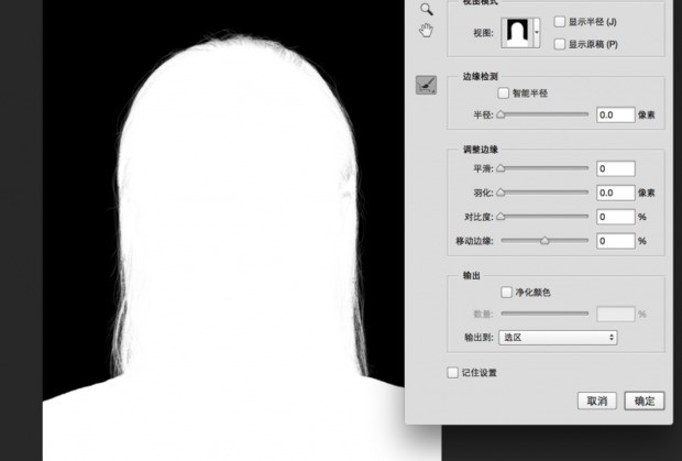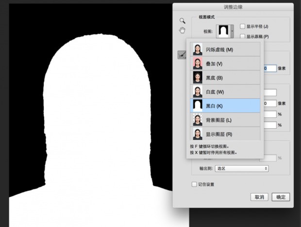 在调整边缘时选择合适的视图模式也非常的重要,推荐这种黑白的视图模式,可以更加清晰的分辨出每一根头发丝有没有被选中。