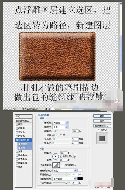 7、调成浮雕图层选区,回到路径面板,把选区转为路径,回到图层面板,新建一个图层,右键路径用刚才做的笔刷描边路径。做出包形年些及马久稳孩的缝纫线,再加点浮雕效果。