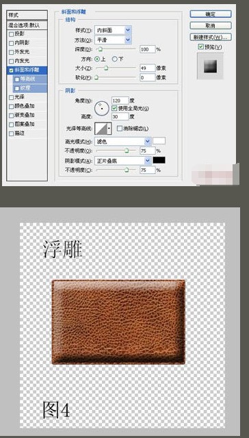 5、双击图层调成图层样式,设置斜面与浮雕,参数及效果如下图。