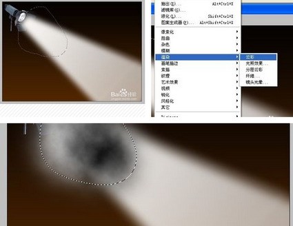 7.接下来,为投影灯增加一些烟雾效果。新建一图层,选择“工具栏”中的“套索”工具,在投影烂肆灯附近创建一选区,并设置羽化半径为“30”。采用默认背景色和前景色,然后执行“滤镜”→“渲染”→“云彩”。