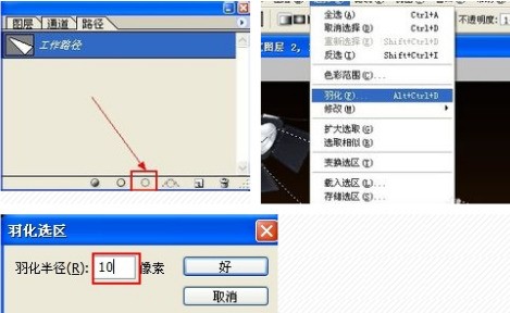 5.打开“路径”面板,点击“将路径作为选区载入”按钮。返回“图层”面板,并将选区的羽化半径设置为“10”。