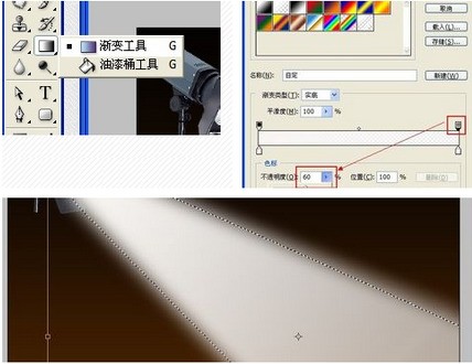 6.选择“工具栏”中的“渐变填充”工具,进行“白色”填充,同时将渐变条一侧的透明度设置为“60%”,然后在选区内拖动进行填充。接着按“Ctrl+T”对选区进行变换,效果如图: