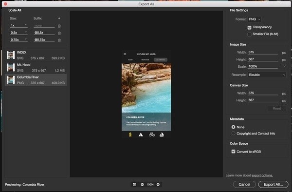 比如在下图的对话框中,导出面板已经与应用的其余部分进行了视觉匹配。此外用户还可以将单一画板导出为另一格式文件,单一或整体的调整JPG质量等设置。