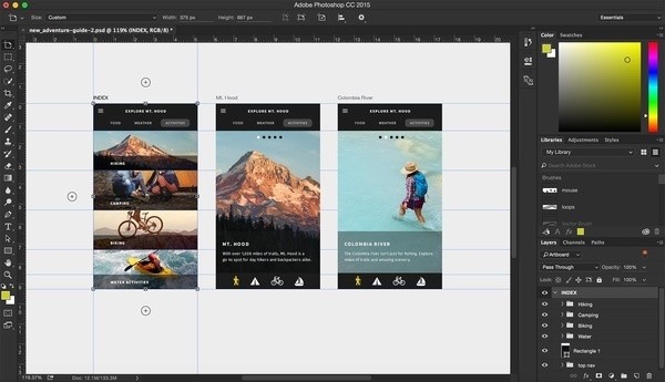 在CC 2015.1版中画板功能得到了功能完善和大量细节优化,现在可以方便的将画板群组,这让复杂屏幕的布局更加简单。参考线也可以与画板锁定,在图层面板也增加了按画板筛选的选项,再也不用反复的点击图层去切换画板了。