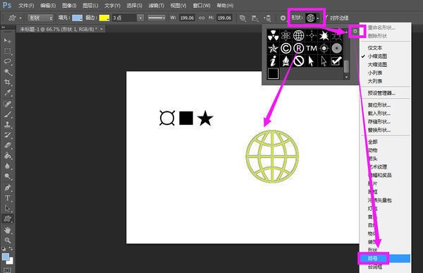 在界面上方点击”形状“栏的小三角形按钮,在弹出来的界面点击右上角的齿轮按钮,然后在弹出来的列表选择”符号“;