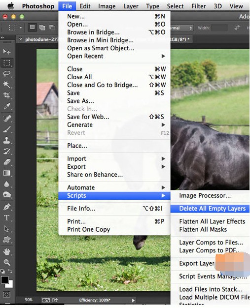 2、要记住的最重要的事情之一是,调整层肯定比复制层更好使用,因为调整层几乎不增加文档的大小。拼合后的图层可以将文件尺寸降低为最小,但是这是非常大的改变,因为你将会失去所有的无损编辑图层。在文件>脚本下你会发现以下这几项,这也可以不用拼合图层而减少文档的大小。