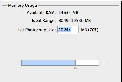Photoshop的性能设置显示了让Photoshop使用多少内存。