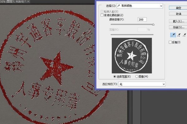 5.选择-颜色范围-吸收颜色,设置公差为200,吸收邮票上的红色,如下图。