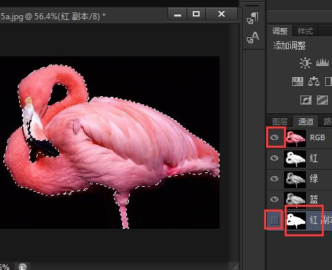 四、色后按着Ctrl键不放,点击复制的这个通道即可选中通道中的白色跳如眼她士区域,即图片主题内容,接着隐藏通道副本,显示RGB通道。
