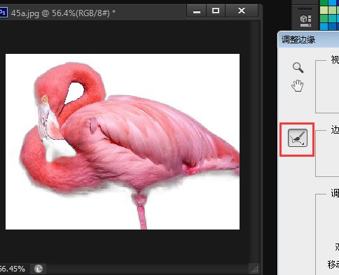 六、点击调整边缘窗口内的“调整半径工具”,把图片上多余的黑色给抹除。