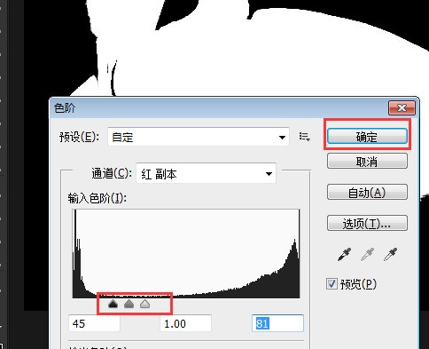 三、然后在复制的这个通道上Shift+L打开色阶窗口,拖动三个滑块,使用内容和背景变为纯黑和纯白,点击“确定”,若是部分图片内容也是黑色,关闭色阶窗口后可以使用白色画笔把前微抓那一区域给涂白即可。