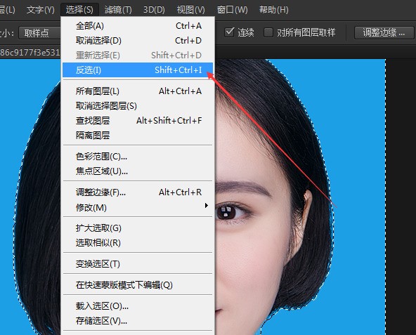 3、执行“选择-反选”命令选中人物,也可以按快捷键shift+ctrl+i。