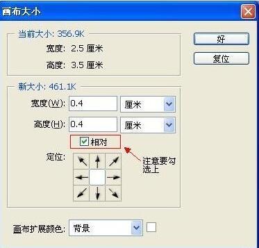 4、加画框(图像一画布大小:(调宽:0.4厘米,高:0.4厘米,相对:打√)点确定)