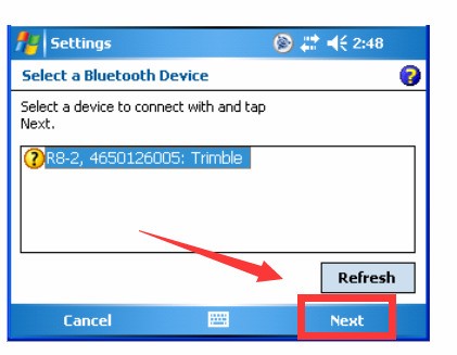 8、我们周围如果有Trimble的GPS接收机已经开机的情况下,我们的手簿能搜索到该设备。如左图列出点选该设备,点击Next。
