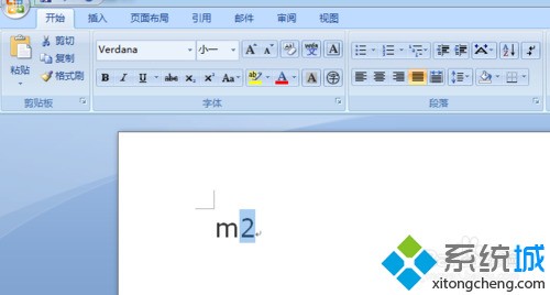 1、打开Word文档在空白处输入“m2”,并选中“2”;