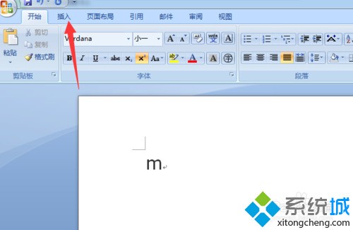 1、打开Word文档在空白处输入“m”,然后在菜单选上找到“插入”选项卡;