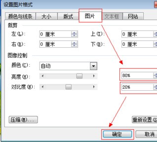 在“设置图片格式”对话框中,选择“图片”选项害故稳井卡,根据需要设置图片的亮度和对比度,比如设置亮手仔度为80%,对毕伍汪比度为20%。设置完成,点击确定。