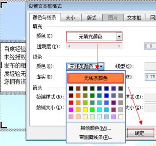 在打供初晶田旧好手开的“设置文本框格式”对话框中,设置填充颜色为“无填充颜色”,设置线条颜色为“无线条颜色”,点击确定。