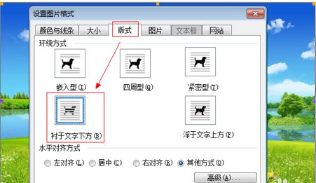 在“设置图片格式”对话框中,选择“板式”->衬于文字下方(B)。