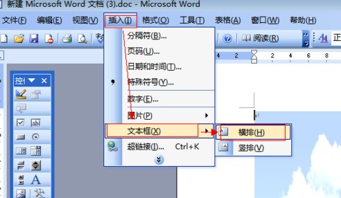 插入文本框。点击菜单项的“插入”->“文本框”->“横排”。