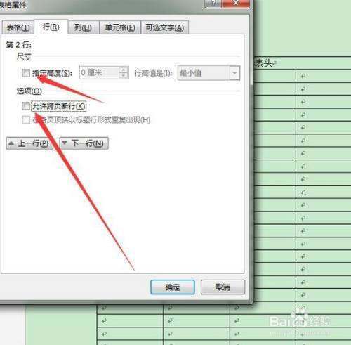 5、在弹出的表格属性对话框中选择“行”选项卡,把“指定高度”和“允许跨行断行”全面的对勾去掉。