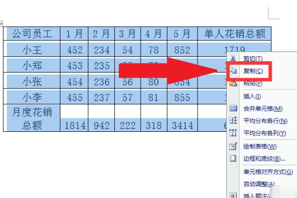 3、选择粘贴以后,再选中我们粘贴的表格,点击右键,选择复制。