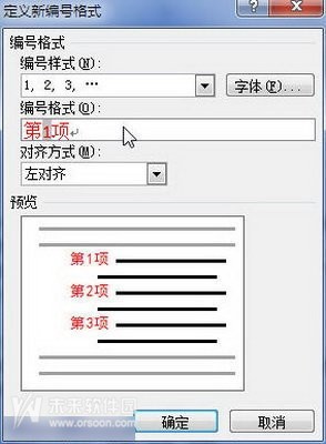 第4步,返回“定义新编号格式”对话框,在“编号格式”编辑框中保持灰色阴影编号代码不变,根据实际需要在代码前面或后面输入必要的字符.例如,在前面输入“第”,在后面输入“项”,并将默认添加的小点删除.然后在“对齐方式”下拉列表中选择合适的对齐方式,并单击“确定”按钮,如图所示.