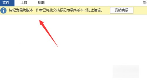 3、如果我们打开视离始磁快等坚的文档,上面有一行黄色字的提示“标记为最终版本作者已将此文稿标记为最终状态以防止编辑”,这时候我们又该怎么办呢。