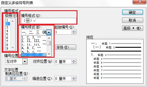 在“级别”里选1,在编号样式里选择“轴才一,二,三(简”,在编号格式的那个“一”前边加半个括号(,在那个“一”后边加半个括号),第一级编号就完成了;