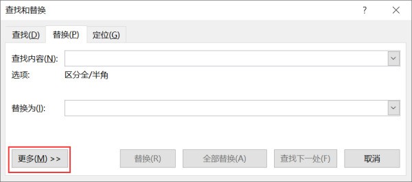 按下Ctrl+H,呼出来再屋名「查找替换」功能,点击「更多」展开功能面板: