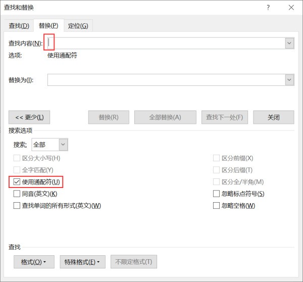 展开后,首先勾选「使用通配织又掌往价食符」,然后将光标点击放入「查找内容」一栏: