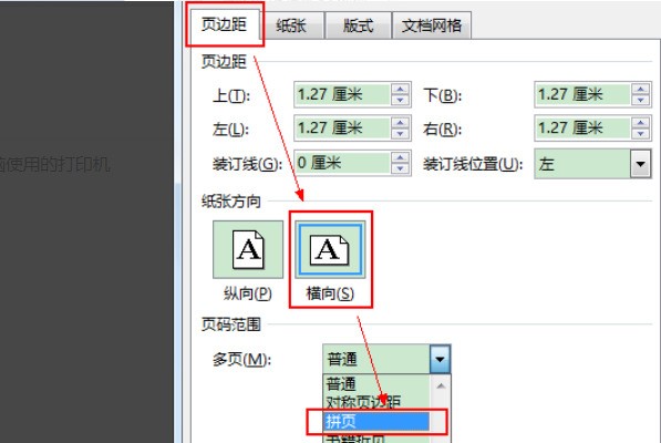 3、接着,完成上述步骤后,在弹出的页面设置对话框的“页边距”选项卡中,选择“横向”作为纸张方向,然后选择“拼页”选项,如下图所示。