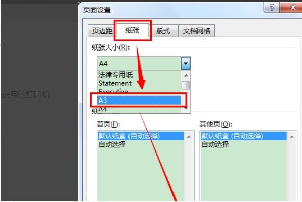 4、然后,完成上述步骤后,切换到“纸张”选项卡,选择“A3”作为纸张大小,然后确认,如下图所示。