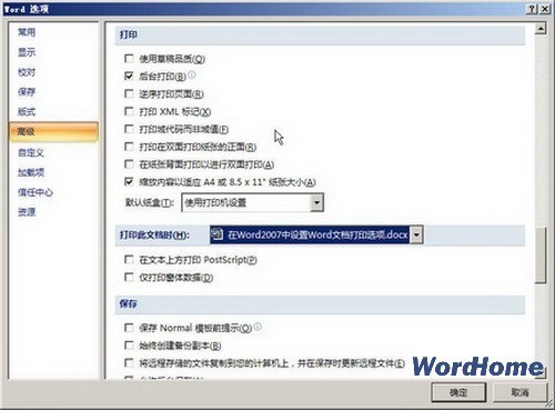 第3步,在Word 2007“Word选项”对话框中切换到“高级”选项卡,在“打印”区域可以进一步设置打印选项,选中每一项的作用介绍如下: