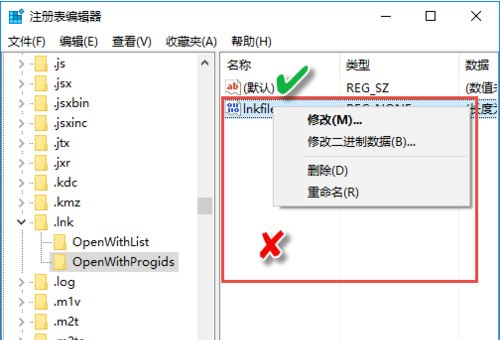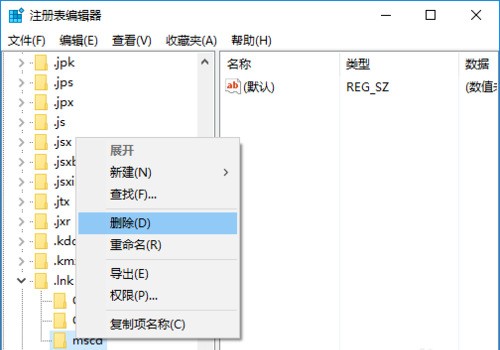 5、点击openwithprogids,在右边中看看除了“默认”这个外有没有其他的,有的话也全部删除。
