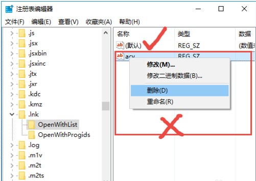 3、点击展开.lnk目录,在该目录下正常是有两个文件夹openwithlist和openwithprogids。如果有其他文件夹,全部都删除,右击文件选择删除。只留下openwithlist 和openwithprogids。