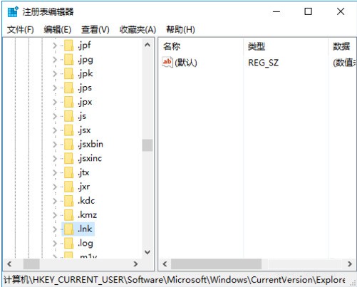 2、在左侧打开“HKEY_CURRENT_USER—SOFTWARE—MICROSOFT—WINDOWS—currentversion—Explorer—FileExts—.lnk 。