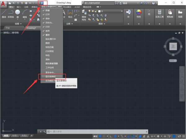 2、在操作界面左云场许述补消村上角找到如下菜单并点击,再点击显示菜单栏菜单,保证设置完后状态为隐藏菜单栏