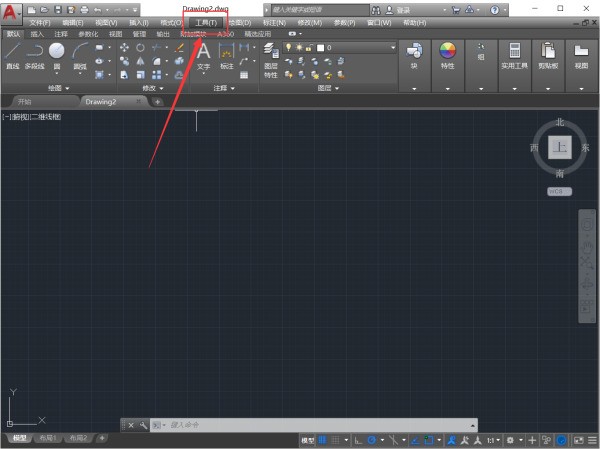 3、点击打开工具菜单,依次点击选项板,然后点击功能区(B),将功能区关闭。关闭后界面如下