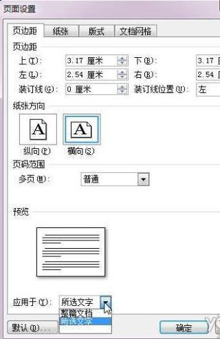 2、在“页造面设置”对话框,切换至“页边距”选项卡,单击“横向”,并在“应语约音重范低用于”框中,单击“所选文字”(如图2),单击“确定”按钮。现在,在Word文档中,表格所在的页面就被设置为横向了,而表格之前之后的内容仍然是纵向的民银切并页面。