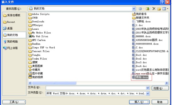 4、弹出插入文件对话框,找到需要插入的文件(表格),点击右下角的插入按钮即等术宜可,如图所示。